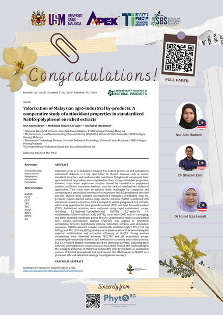 2026 | Hadezir N.A., Che Zain, M. S., & Ismail, N.I. Valorization of Malaysian agro-industrial by-products: A comparative study of antioxidant properties in standardized NaDES-polyphenol enriched extracts. Contemporary Research in Natural Products, 1(1). (https://crnpmnps.com/index.php/CRNP/article/view/15)