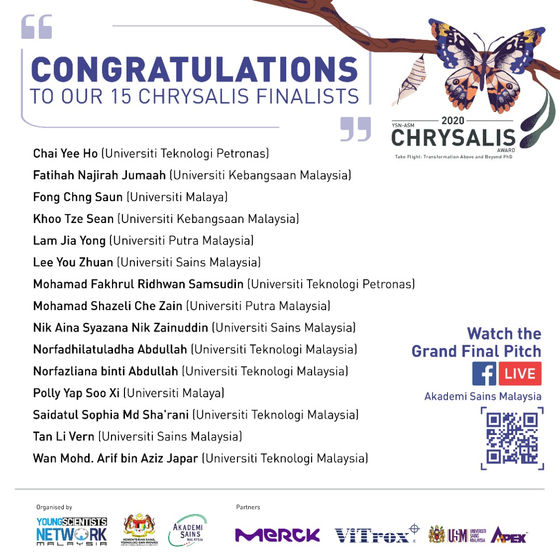Top 15 Finalist Chrysalis Award 2020 was selected by Young Scientist Networks – Academy of Sciences Malaysia. July 2020 – January 2021.